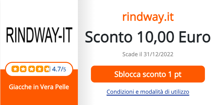 Ottimo Giusy, quindi è l’occasione perfetta per i nostri clienti per provare e comprare i vostri prodotti sul sito Rindway.it, hai messo a disposizione dei nostri clienti un Coupon che possono utilizzare per fare il loro primo acquisto?