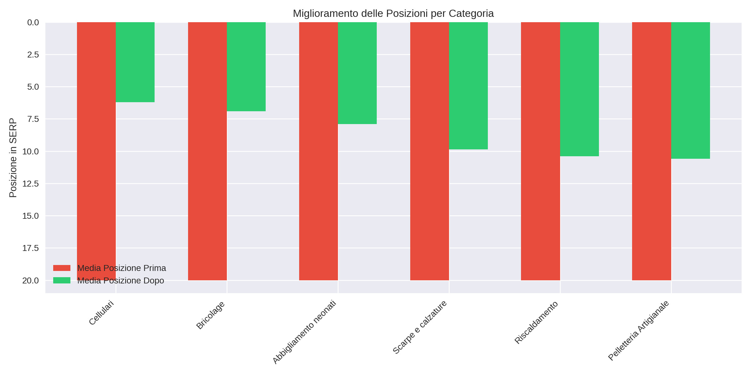 Questo grafico comparativo mostra il miglioramento delle posizioni per le categorie principali, evidenziando il salto di qualità ottenibile con il servizio.