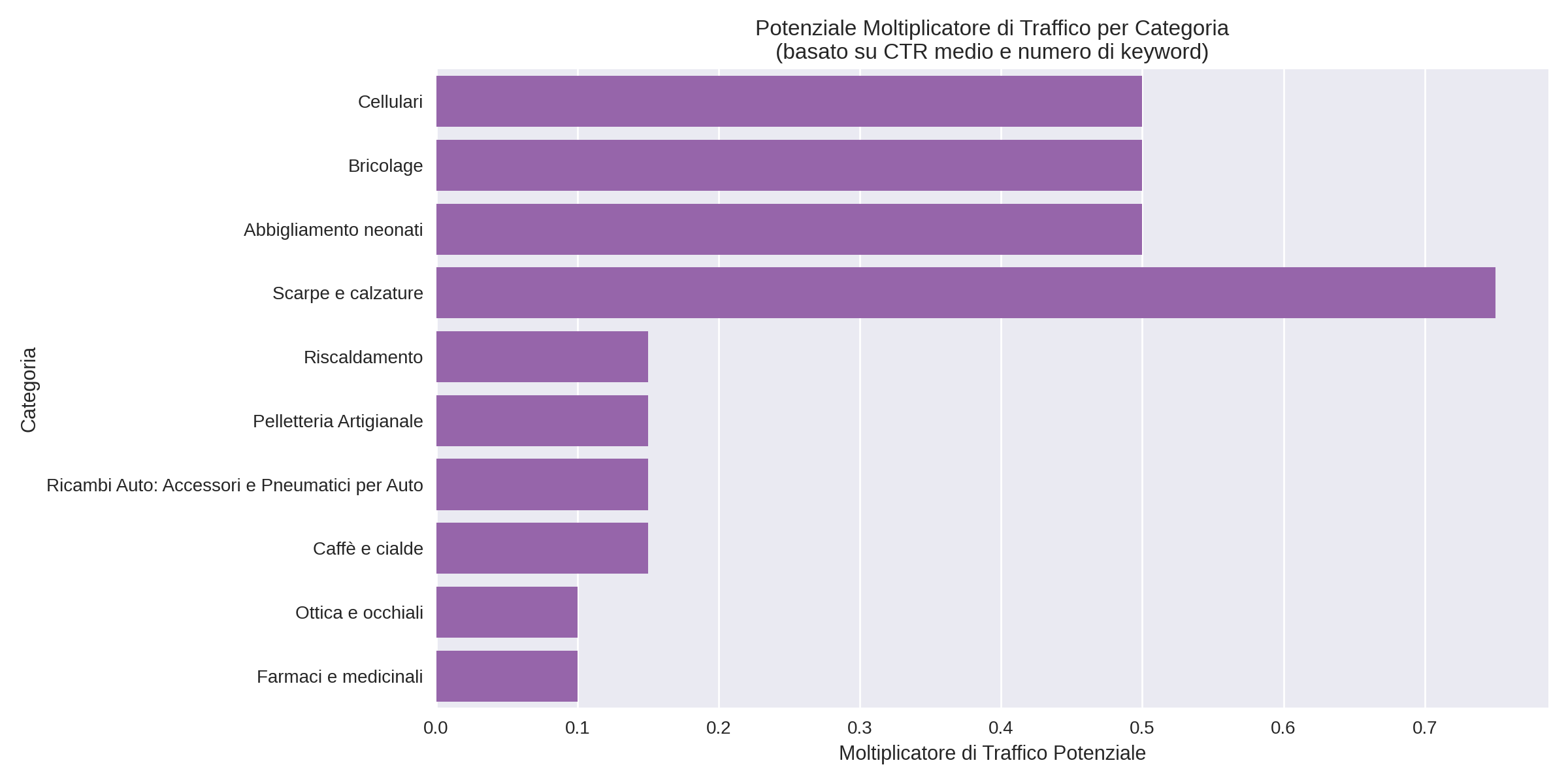 Questa visualizzazione mostra il potenziale moltiplicatore di traffico per categoria, basato sul CTR stimato e il numero di keyword. Dimostrare il ROI potenziale dei nostri clienti.