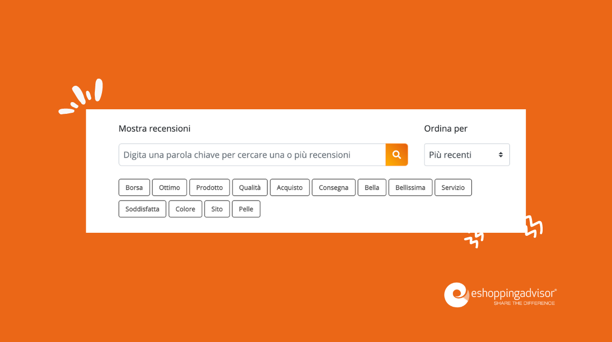 Se stai consultando un eCommerce di borse come pelleteriamarant.com puoi filtrare le recensioni in base alla parola borsa o pelle, altrimenti filtrando per parole chiave più generiche come ottimo o qualità.