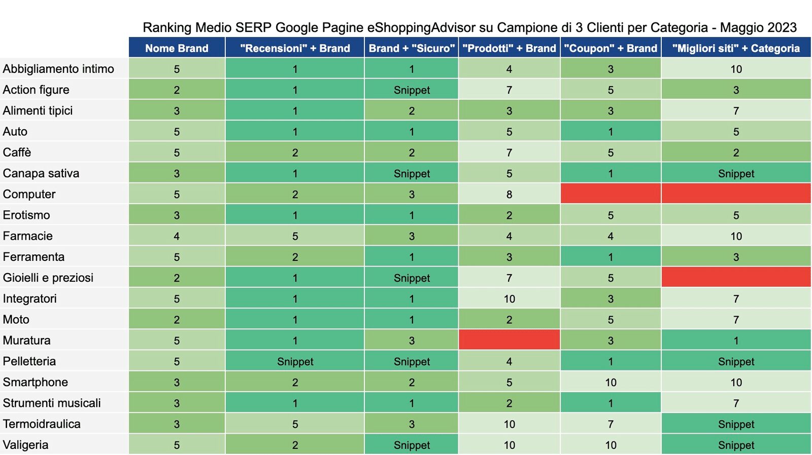 La Mappa Termica mostra la media delle posizioni su Google ottenute nei primi mesi del 2023 dalle pagine presenti su eShoppingAdvisor di tre e-commerce campione rappresentativi di alcune categorie del portale.