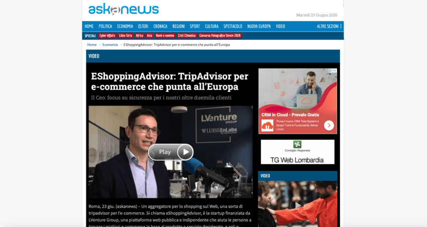 Il Ceo: focus su sicurezza per i nostri oltre duemila clienti Roma, 23 giu. (askanews) – Un aggregatore per lo shopping sul Web, una sorta di tripadvisor per l’e-commerce. Si chiama eShoppingAdvisor, è la startup finanziata da LVenture Group, una piattaforma web pubblica e indipendente che aiuta le persone a trovare i migliori e-commerce in base al prodotto o servizio desiderato, e agli e-commerce ad accrescere la propria reputazione in Rete grazie alla raccolta, gestione e analisi delle recensioni dei…