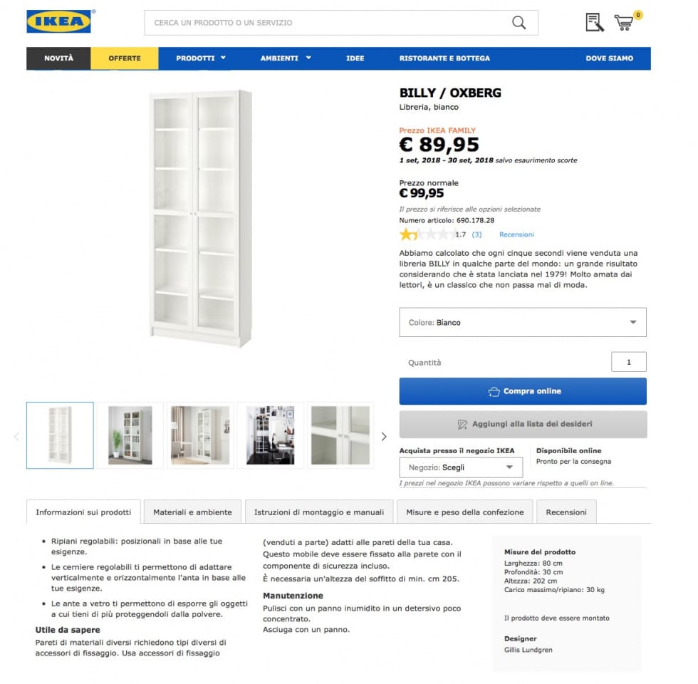 Esempio: La descrizione di un pezzo evergreen come la libreria BILLY, è organizzata con una pagina multitesto con menù a tendina e link che riportano manuali in PDF facilmente scaricabili e comprensibili.