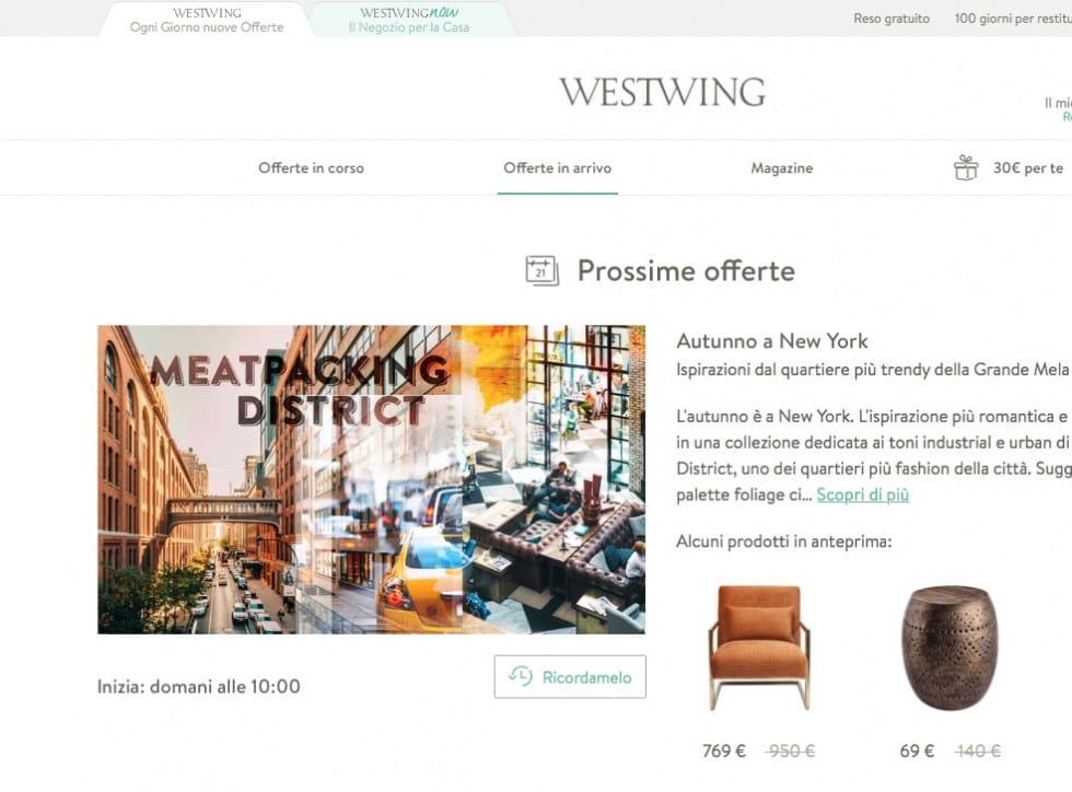 Westwing (ex Dalani): Grandi firme con prezzi da outlet. Davvero una tentazione per chi deve farsi o rifarsi l’arredamento. Le proposte sono sempre diverse. Grande professionalità del customer care, ma anche nei tempi e nella modalità di spedizione.