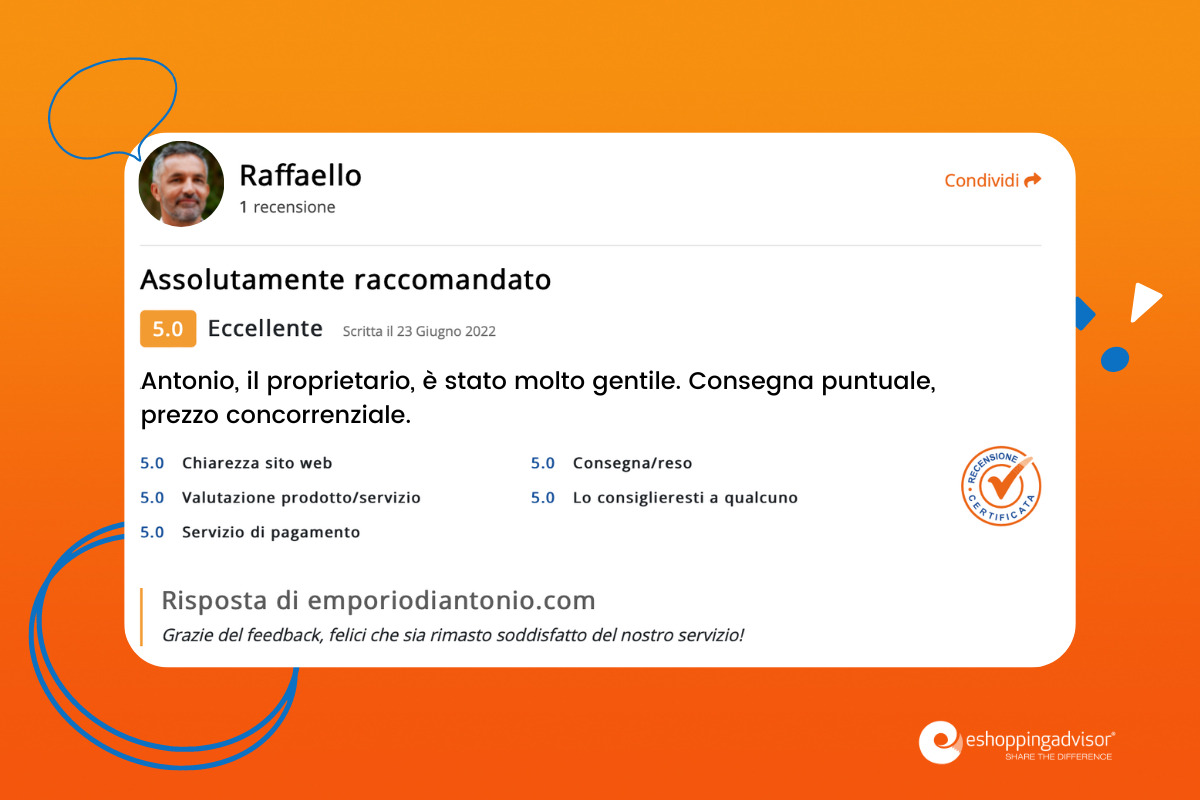 Nel caso di eShoppingAdvisor, piattaforma di recensioni esclusivamente dedicate agli eCommerce, la veridicità delle recensioni è doppiamente garantita proprio dal sistema di verifica. A garanzia dei consumatori viene applicato il sistema di recensioni certificate; le recensioni e le risposte, infatti, vengono analizzate in automatico dal sistema di gestione e pubblicate solo se rispondenti alle condizioni di utilizzo. Il sistema consente di verificare se il recensore ha effettivamente effettuato un acquisto online sul sito recensito, apponendo il sigillo di “recensione certificata” solo a questa tipologia di recensioni.
