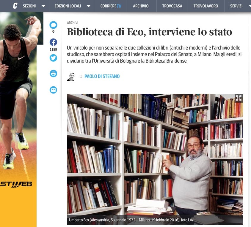 “Acquisti importanti. Ma anche occasioni a poco prezzo trovate sulle bancarelle, pezzi unici che solo un esperto — non solo un collezionista con buone disponibilità economiche — può scovare nelle sue scorribande tra le pagine. È nata così la mitica biblioteca di Eco, cinquantamila volumi, di cui milleduecento rari, un’assicurazione antincendio (da bambino Eco abitava sotto l’appartamento del capitano dei pompieri di Alessandria: da qui, raccontava, il suo terrore del fuoco), il gusto di dedicarla al sapere «falso, occulto, strampalato e alle lingue immaginarie».