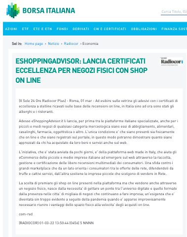 È stata lanciata la notizia riguardante il lancio dei Certificati d’eccellenza, esclusiva di eShoppingAdvisor, dedicati ai piccoli e medi negozi fisici. Un vero e proprio ponte tra l’universo digitale e quello fisico: gli shop potranno mostrare dal vivo le valutazioni ottenute dai loro eCommerce sul web.