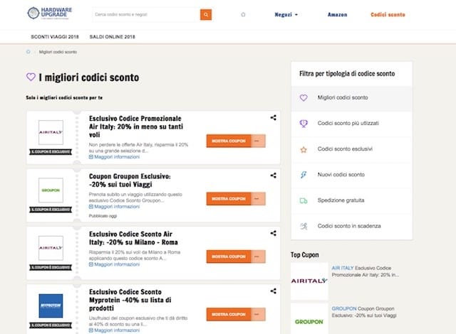 Ma c’è un’altra opzione importante: utilizzare i codici sconto, ovvero quei coupon on line che molti ecommerce mettono a disposizione dei clienti durante l’anno e che solitamente possono essere sovrapposti agli sconti stagionali. Se non si è clienti abituali di un negozio on line non è per nulla facile procurarseli, ma è comunque interessante consultare piattaforme specializzate come Hardware Hupgrade che dal 2012 setaccia i più appetibili codici sconto degli ecommerce. Analoga missione è quella del sito Codicesconto, la piattaforma che chiarisce come funzionano le stringhe alfanumeriche da applicare ai vostri acquisti on line per attivare promozioni:
