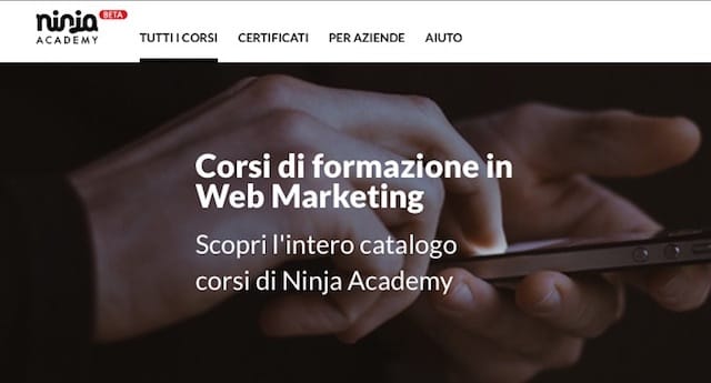 NINJA ACADEMY: I corsi offrono un catalogo che spazia dai corsi base per apprendere i Fondamentali del Web Marketing fino a quelli Avanzati e monografici. Oltre ai tradizionali Laboratori intensivi in Aula che si basano sul faccia a faccia con i docenti, i corsi on line sono molto efficaci, con prezzi nettamente inferiori a quelli “fisici” ma con obiettivi non meno interessanti in termini di risultati. I docenti sono molto qualificati e di solito vengono scelti tra gli influencer di settore. Si va dal content marketing ai vari livelli di conoscenza SEO, dall’ecommerce ai social media. Piattaforma semplice da usare, forum tra docenti e iscritti molto stimolanti.