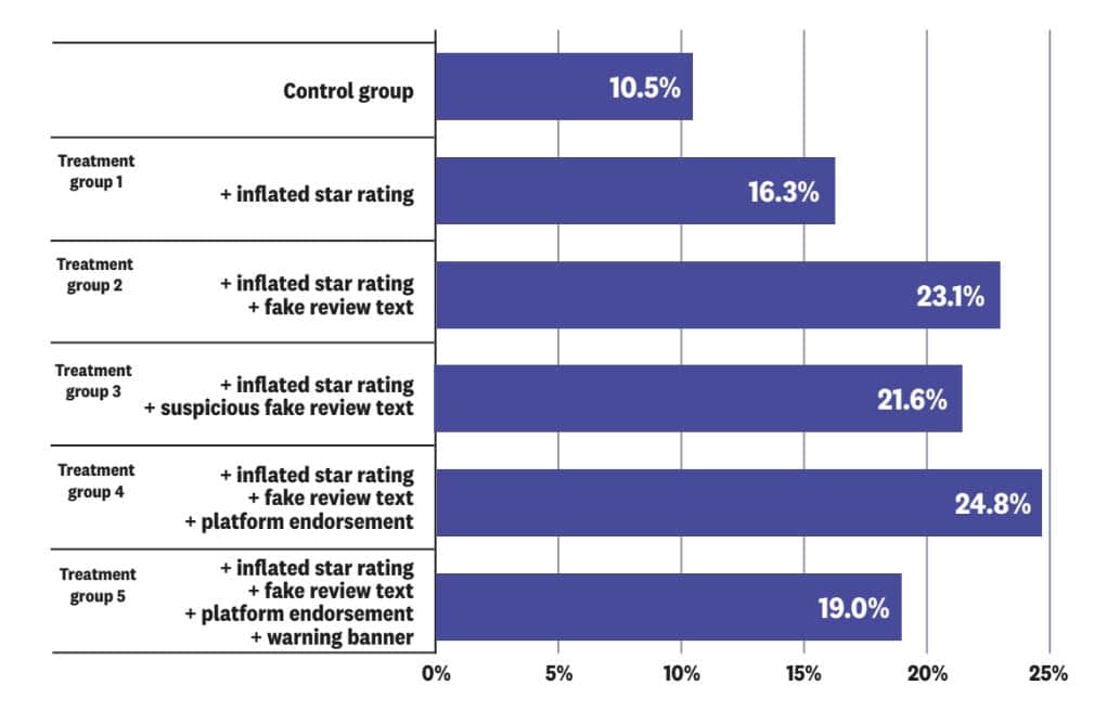 Ciò significa che le persone che si trovavano in questo gruppo avevano oltre il doppio delle possibilità di acquistare un prodotto di scarsa fattura rispetto a quelle che non leggevano recensioni false.