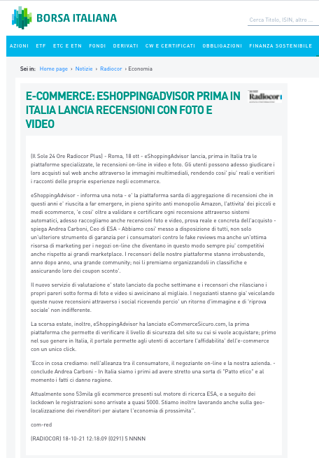 eShoppingAdvisor – informa una nota – è la piattaforma sarda di aggregazione di recensioni che in questi anni è riuscita a far emergere, in pieno spirito anti-monopolio Amazon, l’attività dei piccoli e medi eCommerce. “Oltre a validare e certificare ogni recensione attraverso sistemi automatici, adesso raccogliamo anche recensioni foto e video, prova reale e concreta dell’acquisto – spiega Andrea Carboni, CEO di ESA – Abbiamo così messo a disposizione di tutti, non solo un’ulteriore strumento di garanzia per i consumatori contro le fake reviews, ma anche un’ottima risorsa di marketing per i negozi online che diventano in questo modo sempre più competitivi anche rispetto ai grandi marketplace. I recensori delle nostre piattaforme stanno irrobustendo, anno dopo anno, una grande community; noi li premiamo organizzandoli in classifiche e assicurando loro dei coupon sconto”.Il nuovo servizio di valutazione è stato lanciato da poche settimane e i recensori che rilasciano i propri pareri sotto forma di foto e video si avvicinano al migliaio. I negozianti stanno già veicolando queste nuove recensioni attraverso i social ricevendo perciò un ritorno d’immagine e di ‘riprova sociale’ non indifferente.