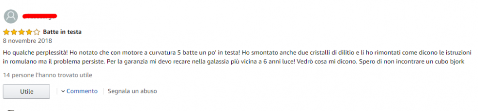 “Ho qualche perplessità! Ho notato che con motore a curvatura 5 batte un po’ in testa! Ho smontato anche due cristalli di litio e li ho rimontati come dicono le istruzioni in romulano ma il problema persiste. Per la garanzia mi devo recare nella galassia più vicina a 6 anni luce! Vedrò cosa mi dicono. Spero di non incontrare un cubo bjork”.