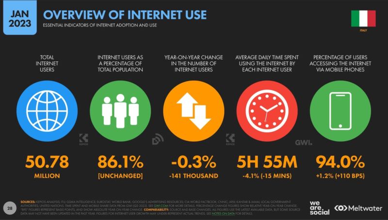 Come era facile aspettarsi le piattaforme del gruppo Meta sono le più utilizzate, dal 89% di Whatsapp fino al 78% di Facebook e al 73% di Instagram. Confermato il dato che adoriamo i cellulari: infatti una persona su tre ha, o utilizza, più di uno smartphone. Il numero di pagine web servite su device portabili ormai supera il 52%, con un incremento del +10% rispetto al 2021. I device Android coprono quasi il 70% del mercato.