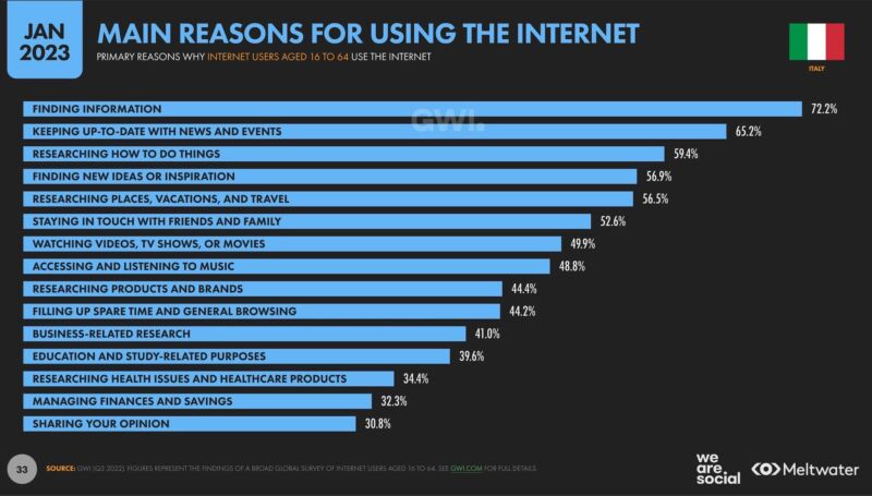 Passiamo in media quasi 6 ore su Internet, di cui quasi 2 ore sui social. Non cambiano in maniera importante le motivazioni che ci spingono a cercare l’accesso al mondo online: cercare informazioni, sia in senso generale (72%) sia per rimanere aggiornati sugli eventi correnti (65%) sia per how-to (59%) rimangono le principali. Interessante, in fondo a questa classifica, che una delle ragioni che ci spingono a essere “animali sociali” online è l’esigenza di condividere opinioni (30%): in questo dato, naturalmente, rientrano anche le recensioni acquisti.