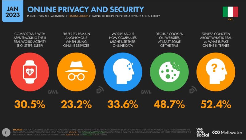 Gli utenti sono sempre più consapevoli del valore dei propri dati: il 23% decide di utilizzare sistemi di navigazione online anonima e quasi uno su due rifiuta generalmente di prestare il consenso ai cookie. Dati che culminano con il 52% delle persone, che esprime preoccupazione in merito al problema di fake news e profili falsi su Internet.