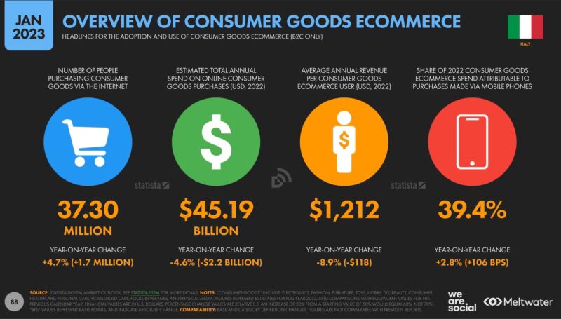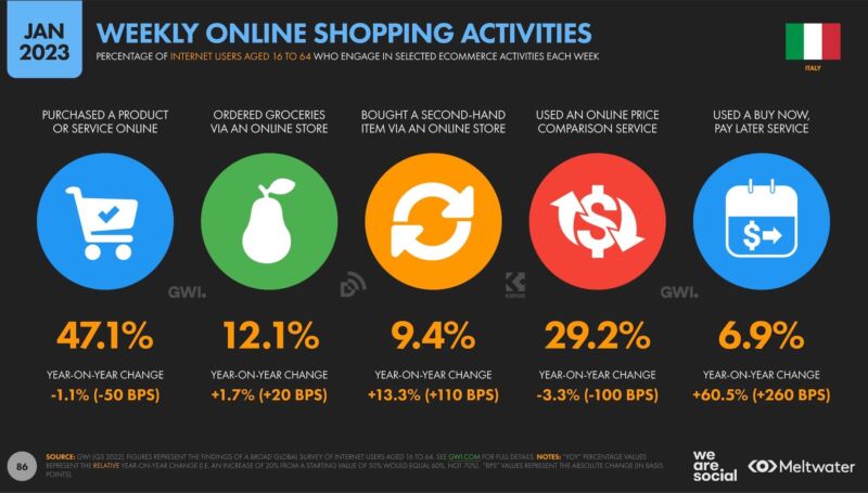 Il 47% degli italiani che usano Internet nella fascia 16-64 dichiara di fare abitualmente shopping online (-1% rispetto all’anno precedente ma ricordiamoci che eravamo in piena pandemia). Il 12% acquista cibo e il 29% utilizza spesso strumenti di comparazione prodotti. Soffrono le categorie “consumer goods”, ad eccezione del fashion e soprattutto del turismo (+83%), dopo due anni di perdite a causa del lockdown.