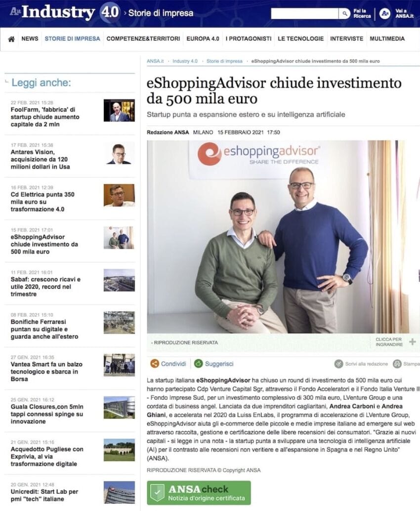 Molte testate, online e non solo, stanno riprendendo la notizia che eShoppingAdvisor, “la startup cagliaritana che sfida i big dell’online promuovendo e valorizzando gli e-commerce delle PMI italiane”, ha chiuso un round di investimento da 500mila euro cui hanno partecipato CDP Venture Capital Sgr (per un investimento di 300 mila euro), LVenture Group e una cordata di business angel.