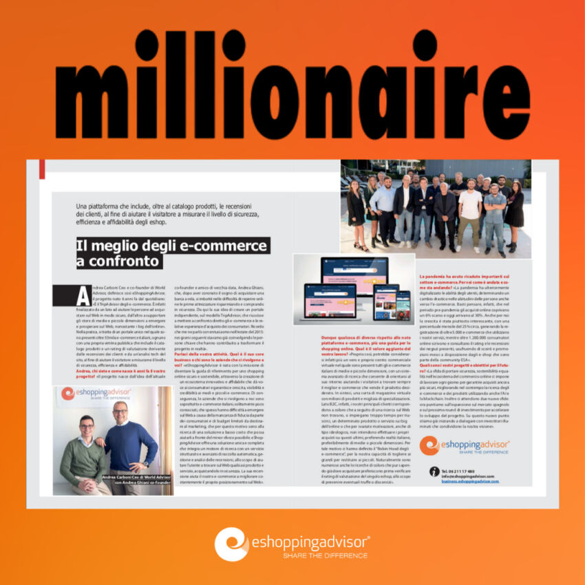 Anche nel numero di febbraio 2022 di Millionaire si parla di eShoppingAdvisor, in particolare di eCommerceSicuro: il tool grazie al quale i consumatori possono verificare in tempo reale il livello di sicurezza e affidabilità degli eCommerce prima di effettuare un acquisto online. Ecco come il mensile di business più letto ha descritto l’anno appena passato per eShoppingAdvisor: “Il 2021 è stato un anno di grande fermento per l’azienda romana, con il rilascio di importanti nuove funzionalità per i clienti b2c…